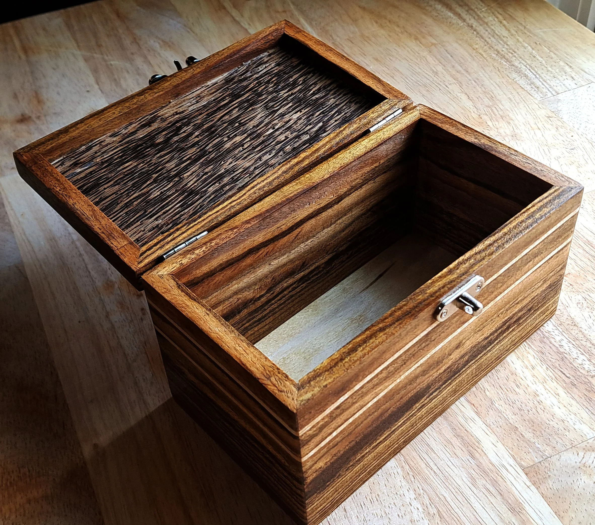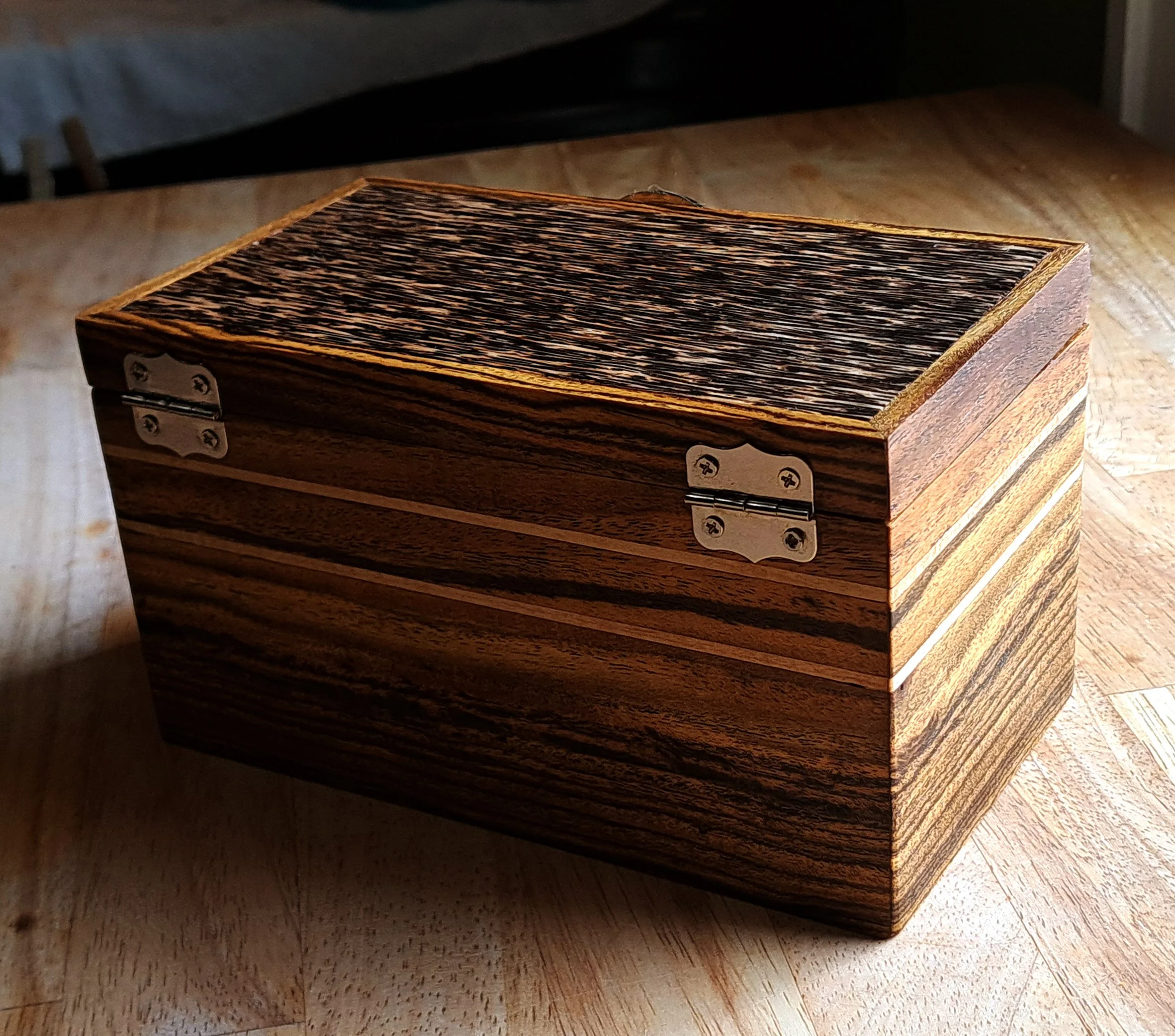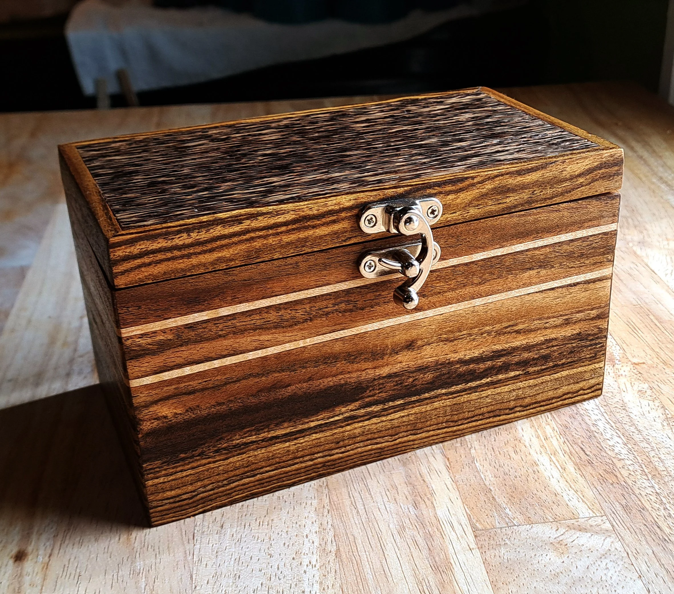 This is a box made from exotic hard wood known as Bocote and inlayed with another type of hardwood called Katalox.